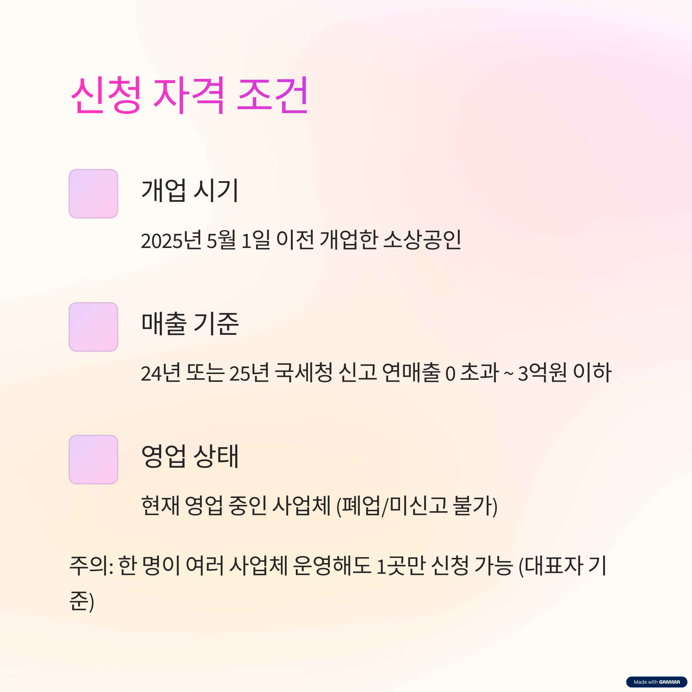 - 중복신청 제한: 1인이 여러 사업체 운영해도 1개만 신청 가능