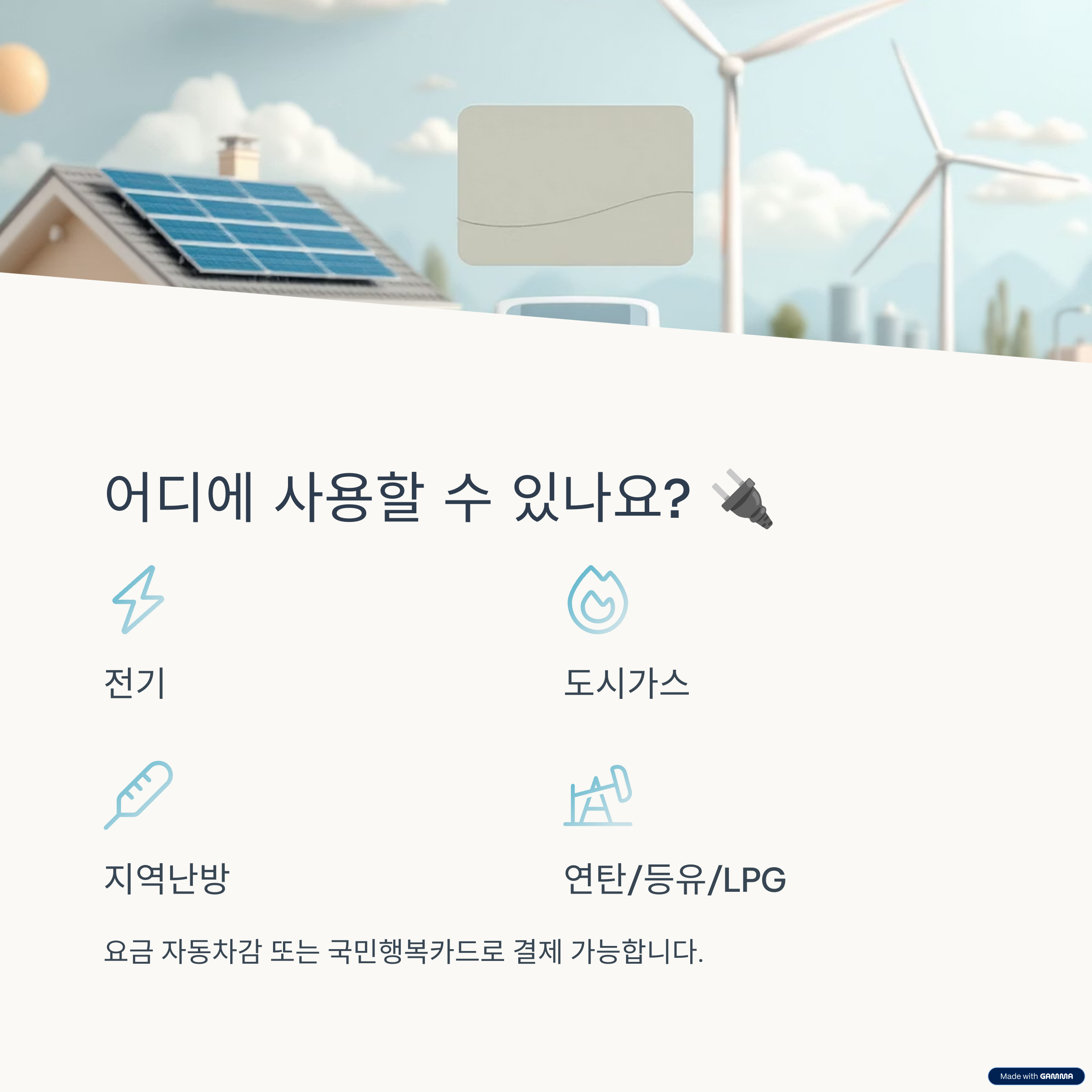 A. 전기, 도시가스, 지역난방, 연탄, 등유, LPG 등 에너지 요금 결제에 사용! 요금 자동차감 또는 국민행복카드로 결제 가능합니다.
