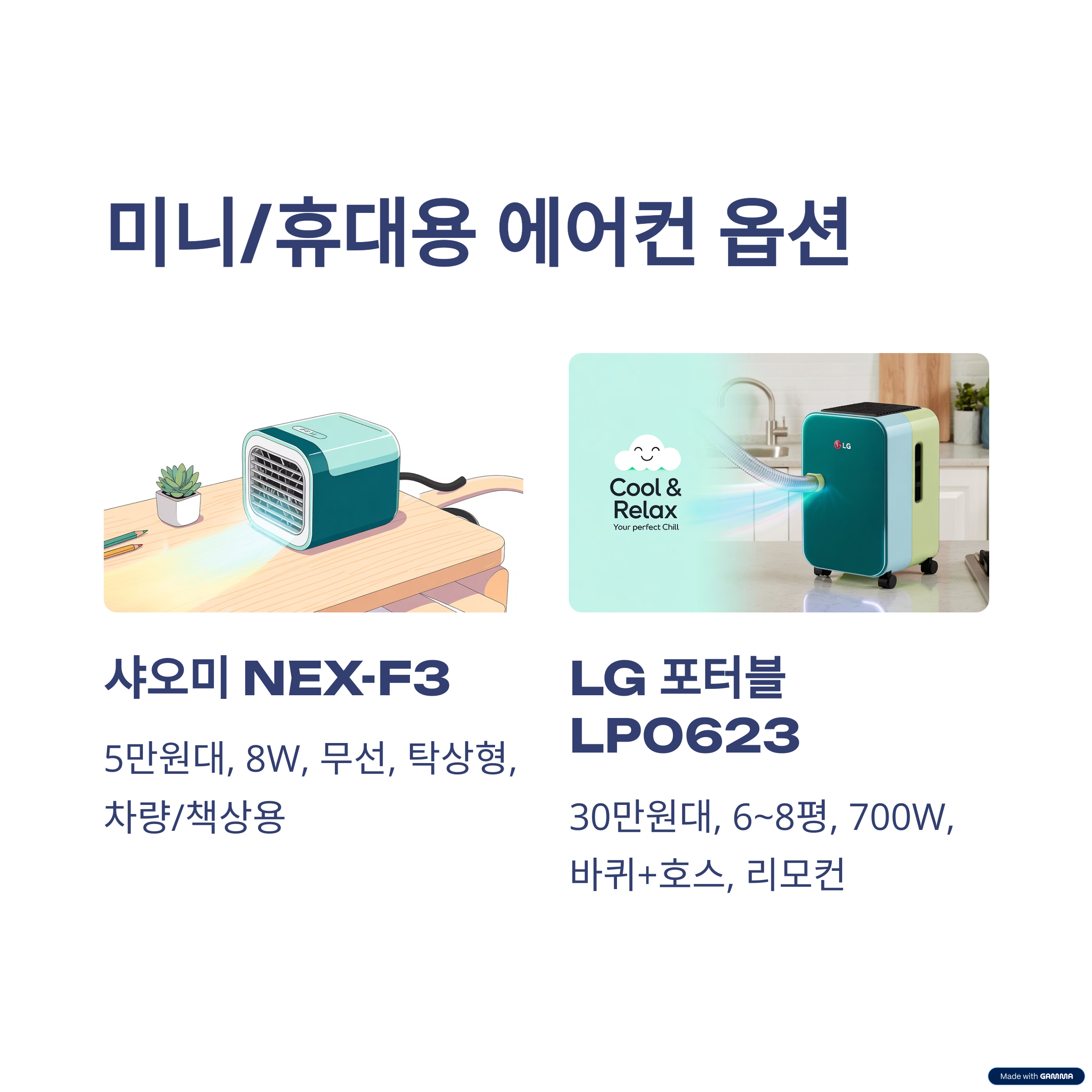 - 샤오미 무선 냉풍기 NEX-F3: 5만 원대, 8W, 무선·탁상형, 차량·책상용