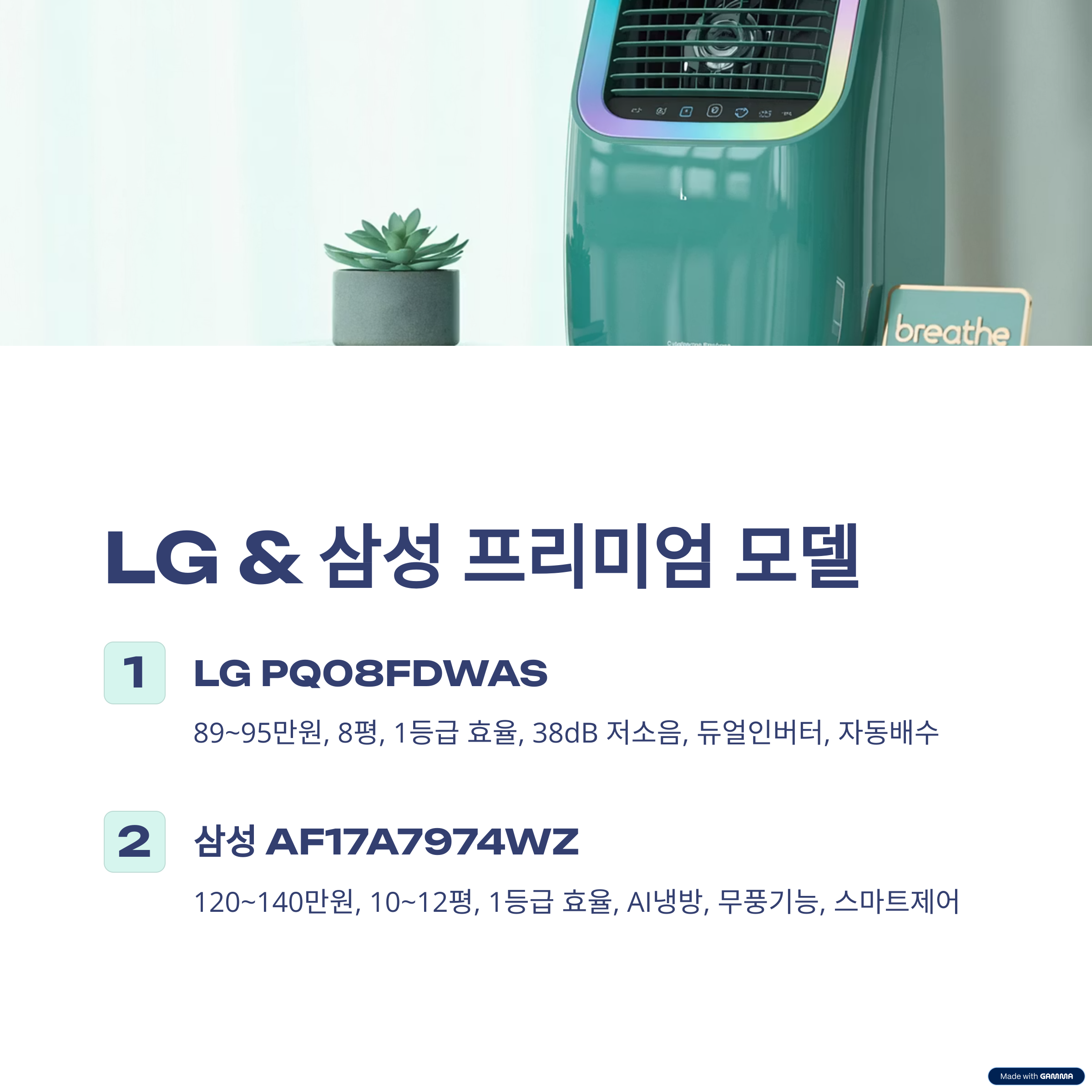 - 강점: 무풍냉방, AI 스마트제어, 1등급 에너지, 음성제어, 절전·자동건조