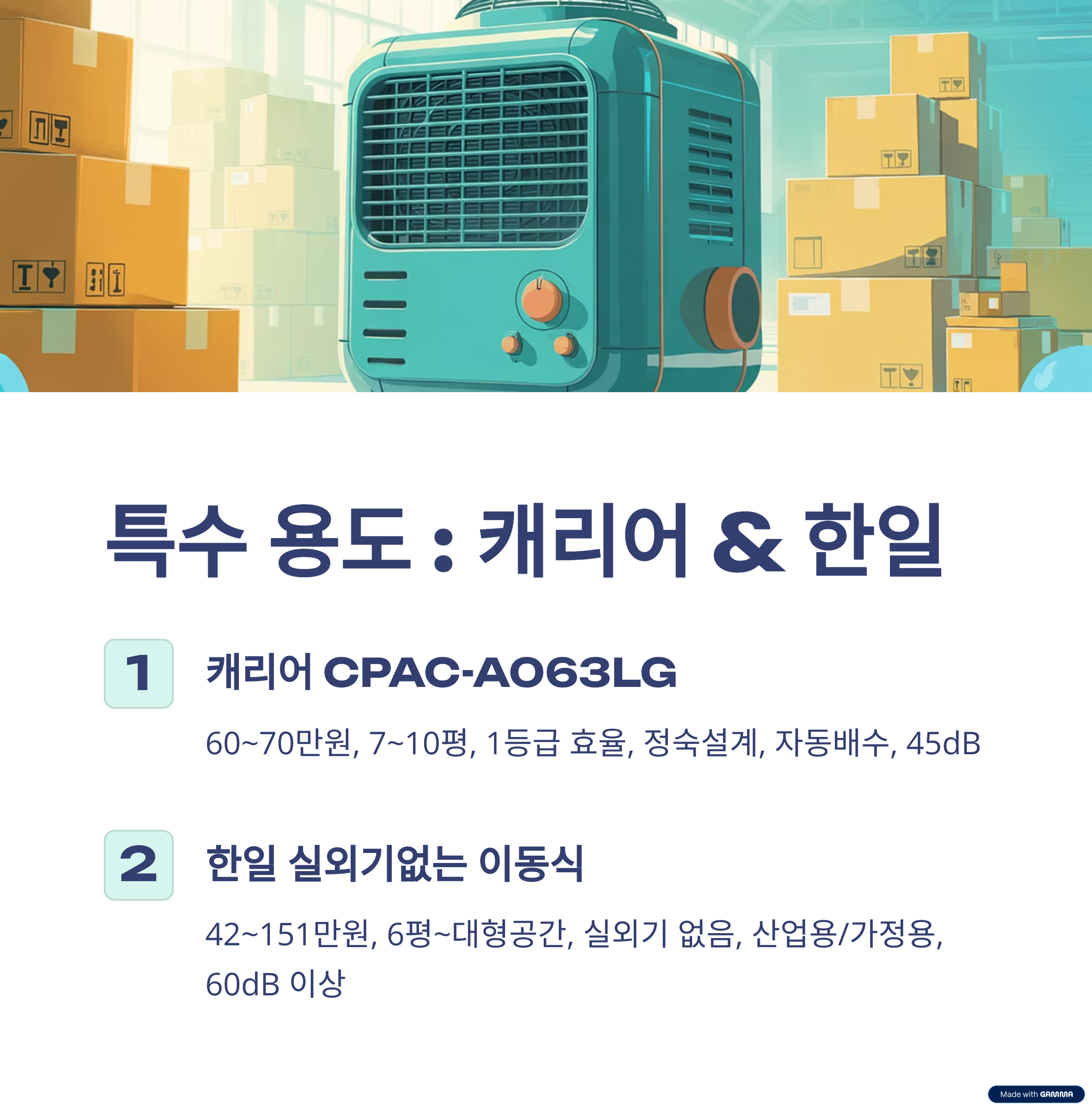- 강점: 실외기 無, 산업용 대용량, 가정·업소·캠핑용