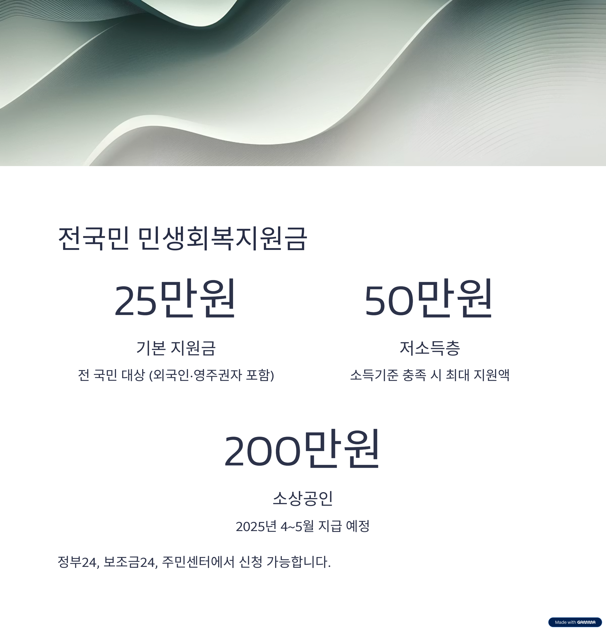 - 지급액: 1인당 25만 원(저소득층 최대 50만 원, 소상공인 최대 200만 원)