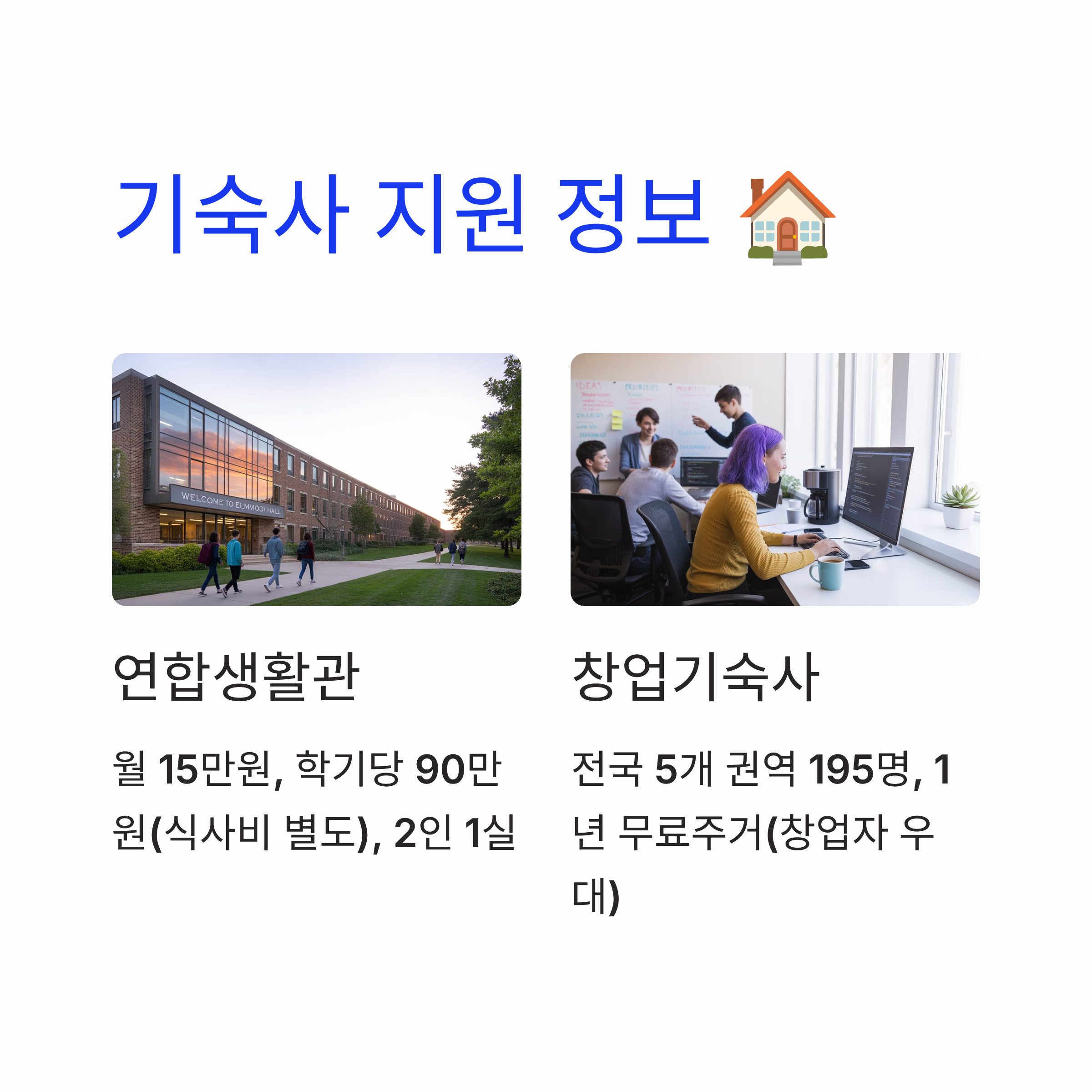 | 기숙사 지원 | 연합생활관 월 15만원/학기 90만원, 창업기숙사 1년 무료 | 지역별 195명 모집 |
