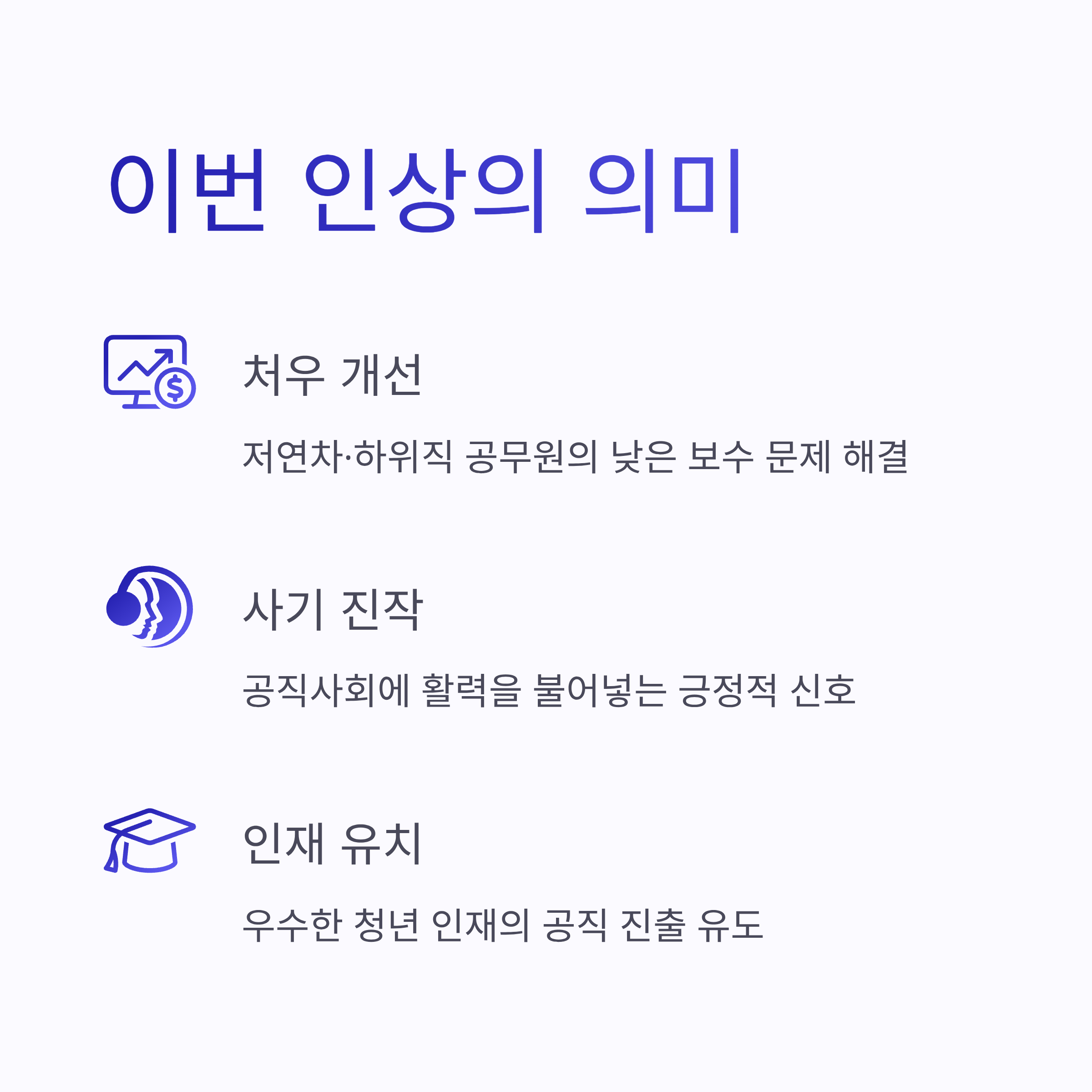 - 기대 효과: 공직사회 사기 진작 및 청년 인재 유입 촉진